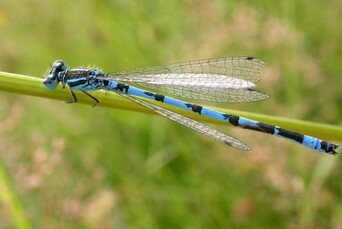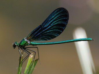 La doncella azul. Puede ser tan abundante que llega un momento en que apenas le prestemos atención. Pero es casi seguro que en cualquier río o regato gallego veamos revolotear estas pequeñas libélulas de color metalizado sobre el agua, creando reflejos ante nuestros ojos. Lo más habitual para observarlos es mirar a las zonas soleadas sobre el agua, con posaderos como vegetación o rocas. Cuando el sol va declinando pueden ascender más para posarse en ramas más elevadas de alisos o sauces. Su época de vuelo va de mayo a septiembre, pero puede haber algunas excepciones.