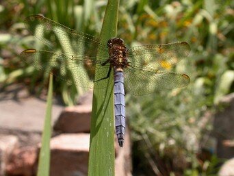 Nombre común: Libélula azulSu nombre obedece a las manchas oscuras situadas sobre las alas, dos manchas por ala, la parte superior interior de las alas tiene una coloración amarillo ahumado.