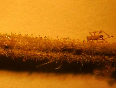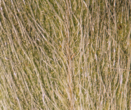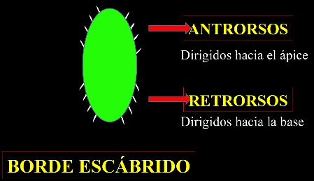 A la izquierda. Pelos rígidos cortos, setas, acúleos orientados hacia el ápice o la base y que resultan cortantes o rugosos al pasar la mano en dirección contraria a su orientación. Pueden situarse en el borde o en la superficie del órgano en el que se sitúan. Según estén orientados hablaremos de antrorso-escábridos o retroso-escábridos.