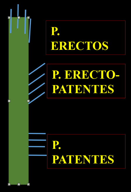 P. ERECTOS: desde su nacimiento se dirigen hacia el ápice. En general a los pelos tumbados sobre una superficie se les llama P. Aplicados.