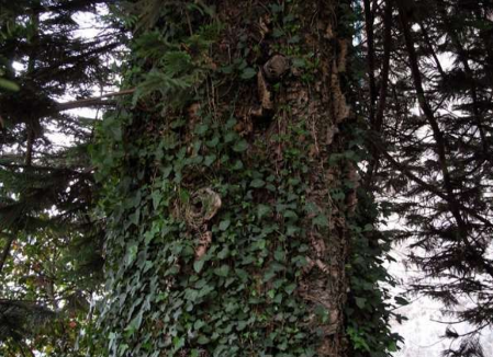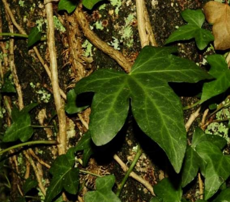 A la izquierda la Hedera hibernica (G.Kirchn.) Carrière. Los tallos adultos emiten raíces que fijan la hiedra al soporte. Son capaces de adherirse.