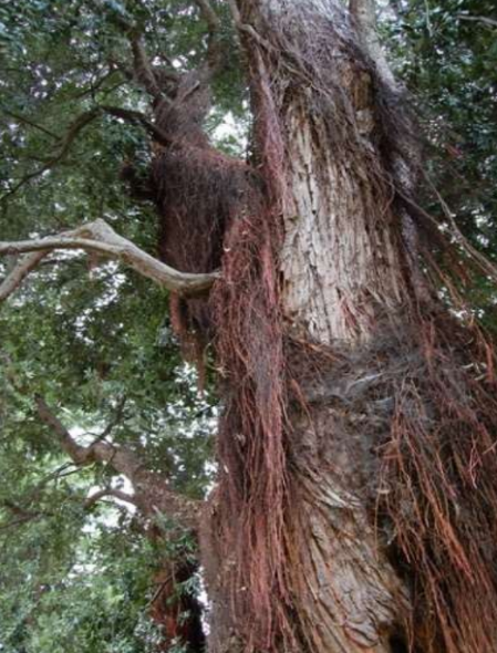 A la izquierda raíces adventicias aéreas colgando del tronco de un metrosidero. Metrosideros excelsa Gaertn. (Myrtaceae)