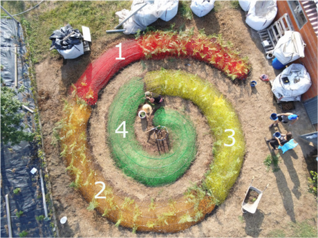Pongo como ejemplo esta espiral en la que tengo planificadas cuatro zonas, en la que hemos decidido hacer rotaciones de cuatro años, pero podría ser diferente. En este caso explico una rotacion basada en el consumo de nutrientes: